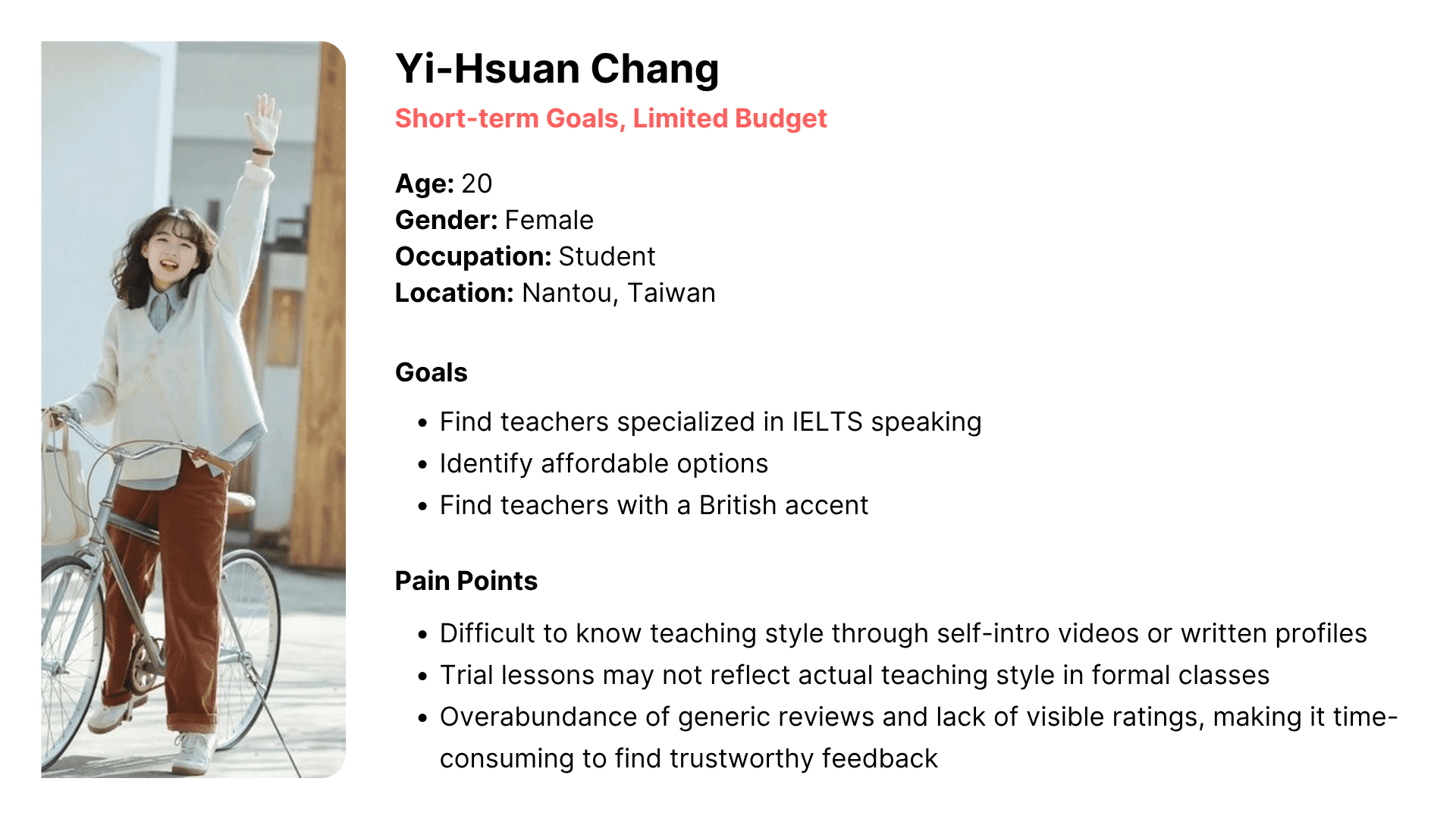 I focused on those who use the platform for short-term goals (e.g., exam preparation) but have limited budgets and analyzed their goals and pain points to inform design decisions. A primary persona was created for better understanding of those users.
