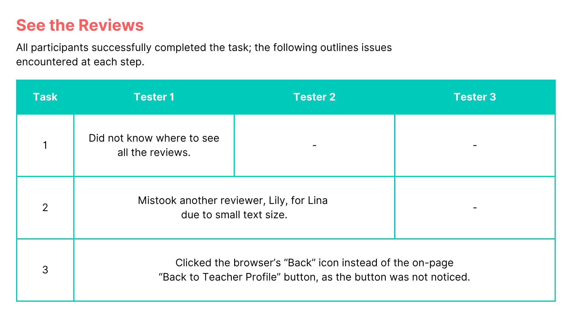 Users had difficulty finding a way back to the teacher’s profile from the “All Reviews” page