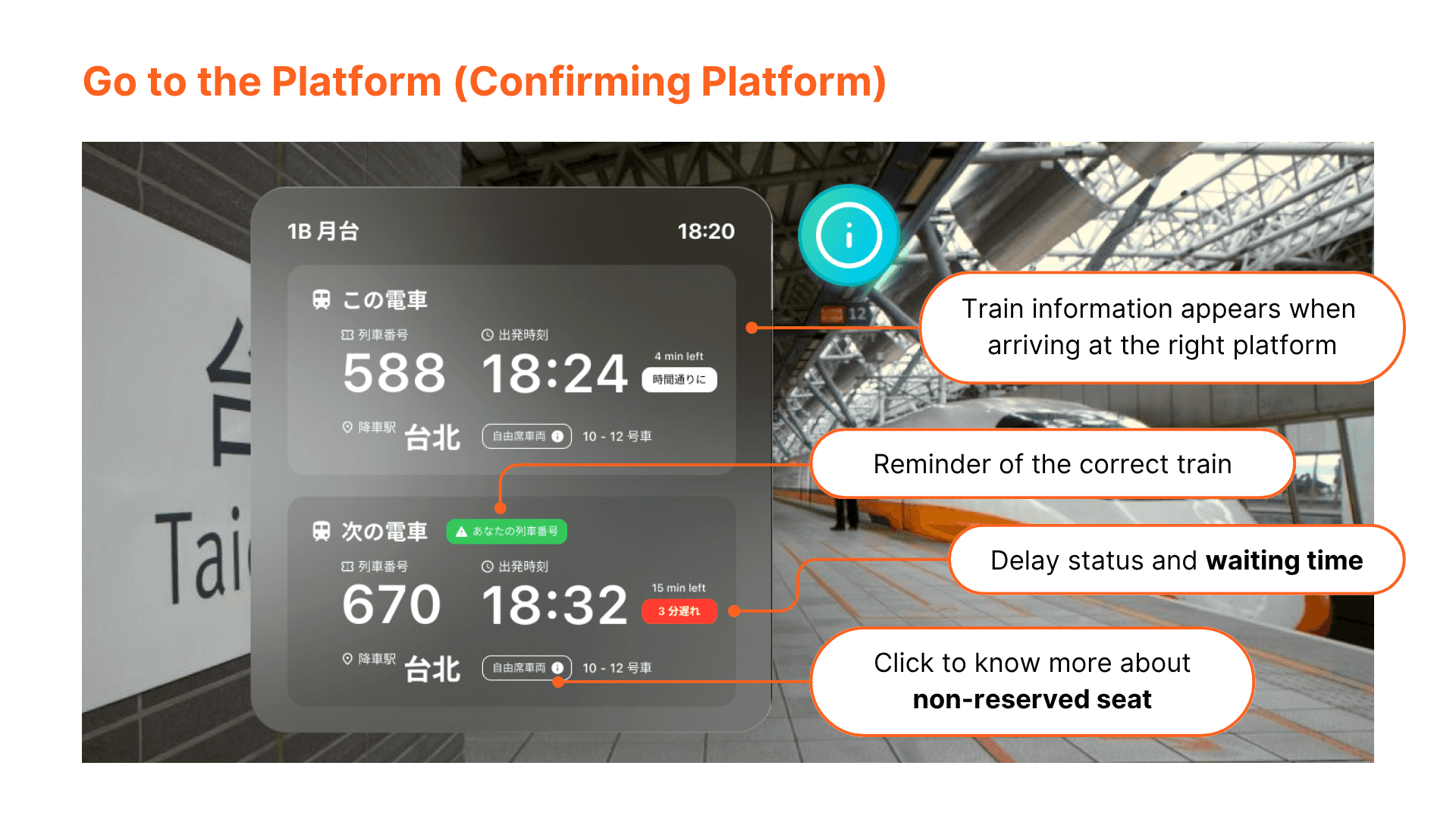 → The station signage interface dynamically adapts based on the user’s purchased ticket details.
